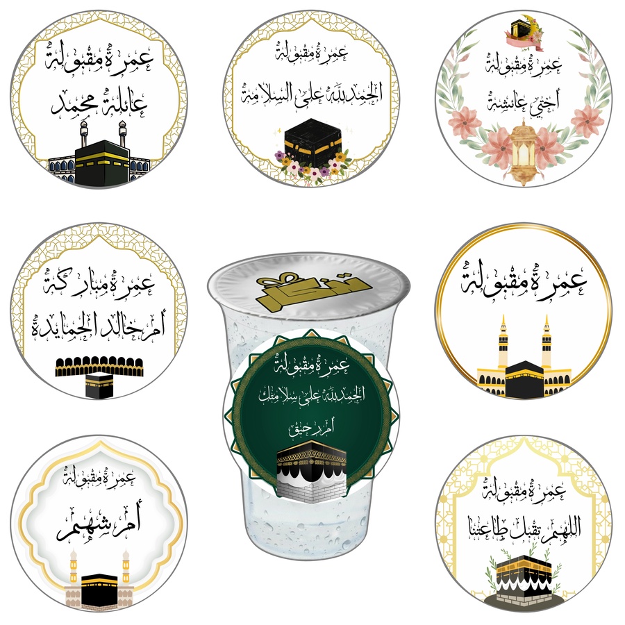 ✨ ستيكرات لاصقة لكاسات الماء – تصميم العمرة ✨🕋🌙