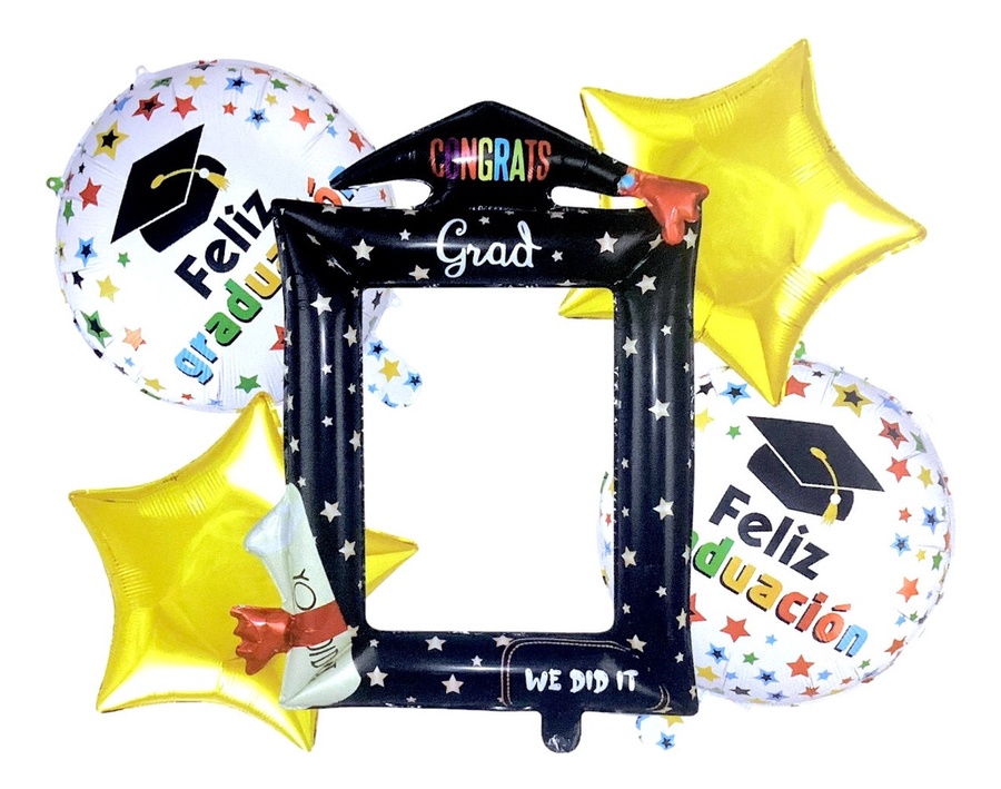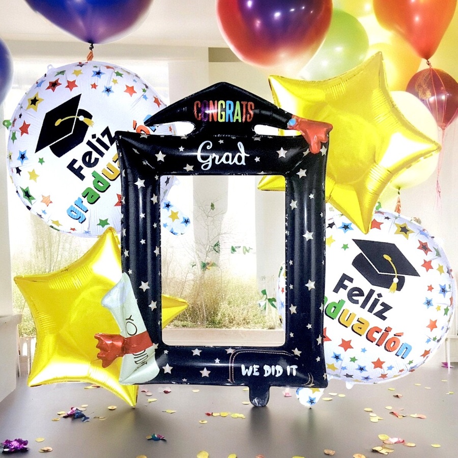 • الوصف: إطار بالون كبير باللون الأسود ومرصع بالنجوم البيضاء، مصمم على شكل قبعة تخرج. مكتوب عليه عبارات تهنئة مثل "CONGRATS" و "Grad" و "WE DID IT" (لقد فعلناها). يظهر على الإطار ذراعا شخص يمسك شهادة تخرج ملفوفة.
