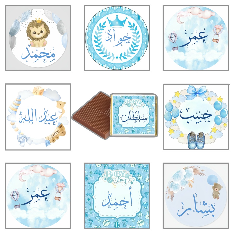 أضف لمسة فخمة على توزيعات مولودك الصغير مع ملصقات الشوكولاتة المخصصة للأولاد 🎉