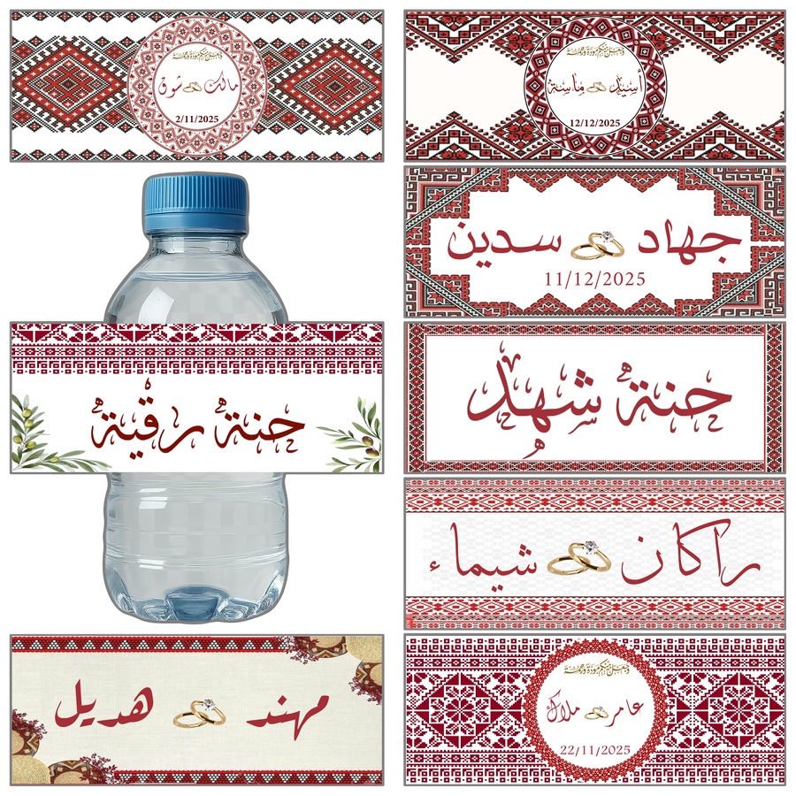 ستيكرات بتصاميم راقية وملونة تضيف لمسة فخمة على علب الماء وتعكس أجواء الاحتفال الخاصة بالحفل.