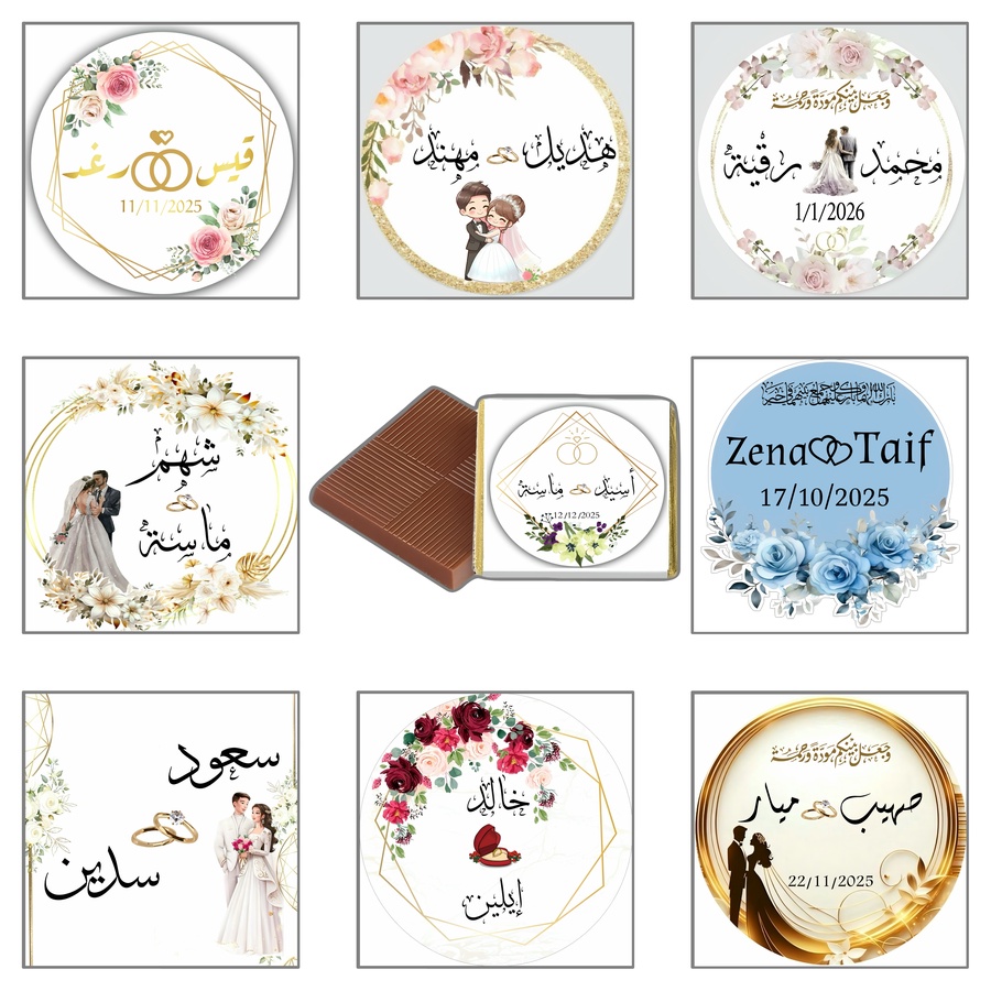 أضيفوا لمسة فخمة على توزيعات الزواج مع ملصقات الشوكولاتة المخصصة التي تجعل لحظة الفرح أكثر تميزًا وأناقة 🌟