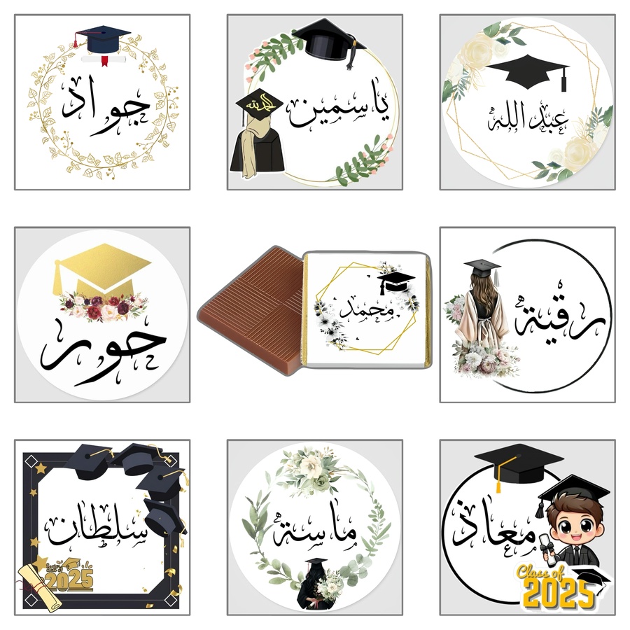 أضف لمسة فخمة على توزيعات النجاح أو التخرج مع ملصقات الشوكولاتة المخصصة التي تجعل لحظة الفرح أكثر تميزًا وأناقة 🌟