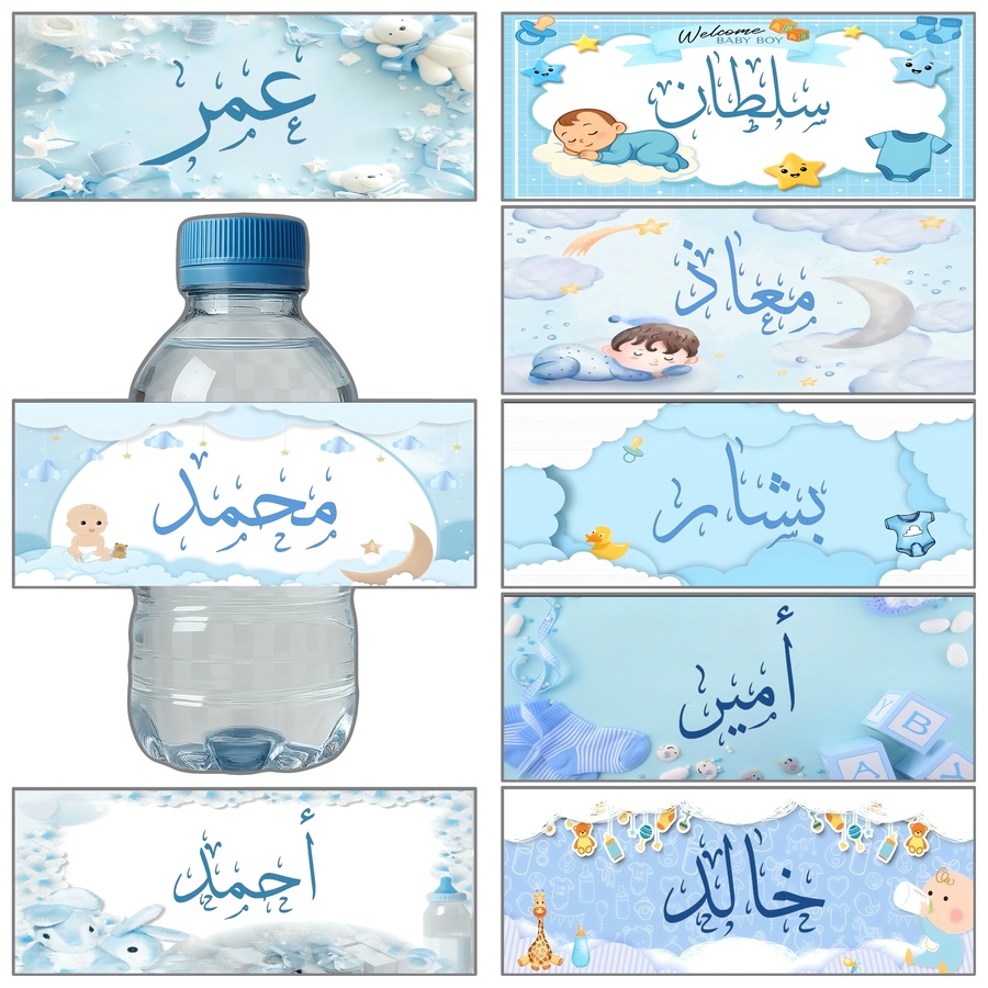 ستيكرات بتصاميم ناعمة وأنيقة تضيف لمسة فخمة على علب الماء في حفلات البيبي شاور، السبوع، والزيارات الخاصة بالمولود.